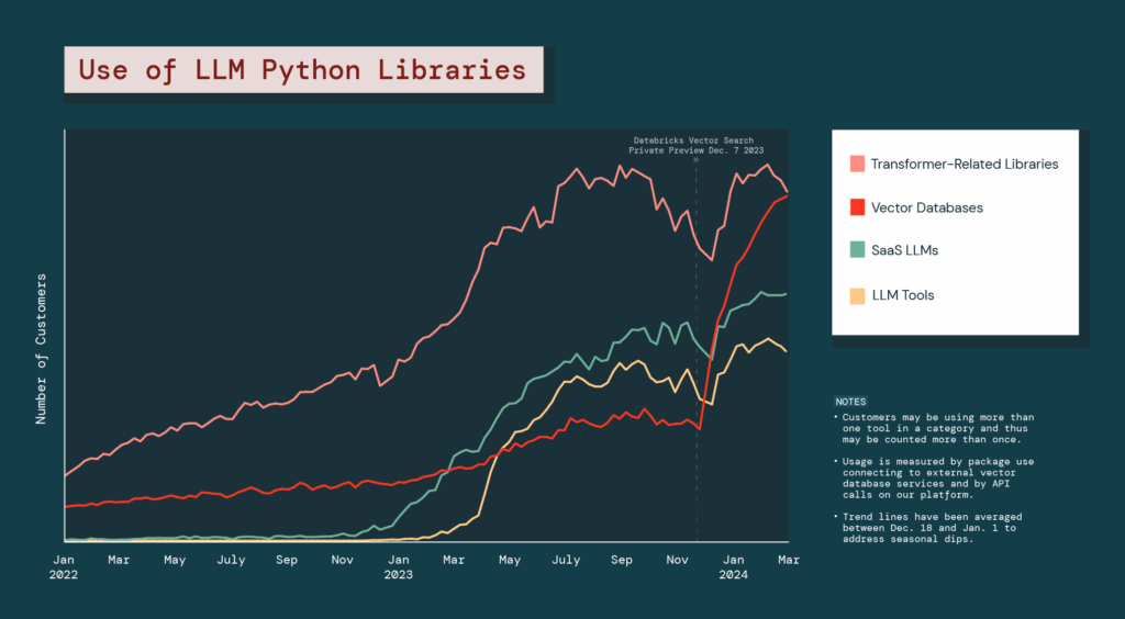 Este estudio de Databricks muestra el crecimiento disruptivo del uso de las bases de datos de vectores a la hora de crear aplicaciones de IA generativa (RAG). ¿Qué quiere decir este gráfico? que la mayoría de empresas que utilizan IA generativa (en Databricks, en este caso) buscan construir sus soluciones de IA con datos propios y con LLMs pre entrenados para mejorar la calidad de respuesta. Así, la IA “entiende” el contexto de lo que estamos buscando y alucina menos. Se podría pensar que estas soluciones son sólo para empresas grandes. No es el caso, es posible que una empresa mediana y pequeña pueda implementar estas aplicaciones y ser competitiva.